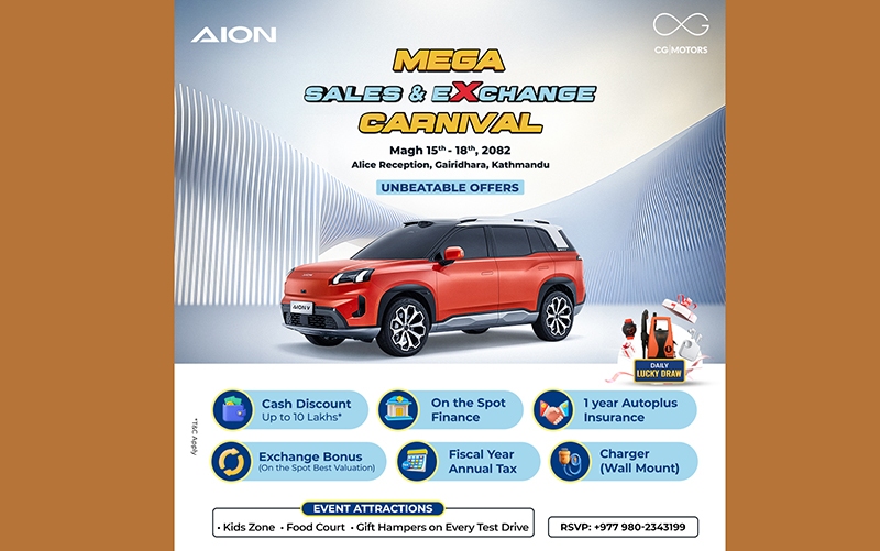 काठमाडौं - नेपालमा एवोन विद्युतीय सवारीसाधनको आधिकारिक वितरक सीजी मोटर्सले नेपालकै सबैभन्दा ठूलो मेगा सेल्स एण्ड एक्सचेन्ज कार्निभल आयोजना गरेको छ। यस कार्निभलमार्फत ग्राहकहरूले विश्वप्रसिद्ध विद्युतीय सवारी ब्रान्ड एवोनका गाडीहरू आकर्षक तथा विशेष अफरसहित अनुभव गर्न सक्नेछन्।