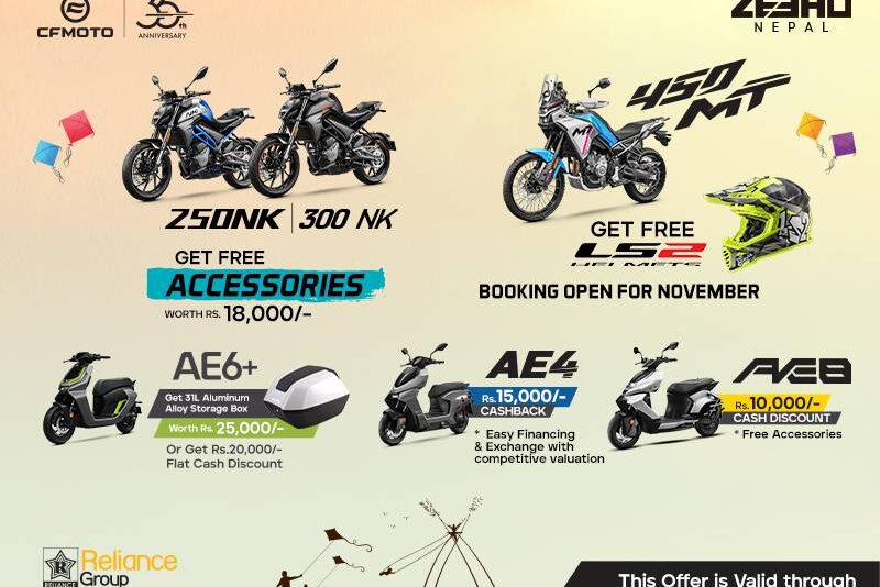 काठमाडौं - नेपालका लागि सिएफमोटो र जिहो ब्रान्डको आधिकारिक वितरक रिलायन्स ग्रुप अन्तर्गतको ऋषि ट्रेड सेन्टरले दुवै ब्रान्डका लागि चाडपर्व अफर सार्वजनिक गरेको छ । दशै, तिहार तथा छठ लगायतका विभिन्न पर्वहरुको अवसरमा ल्याइएको सो अफर अन्तर्गत दुवै ब्रान्डका बाइक तथा स्कुटर किन्ने ग्राहकले आकर्षक छुट र थप सुविधा प्राप्त गर्नेछन् ।