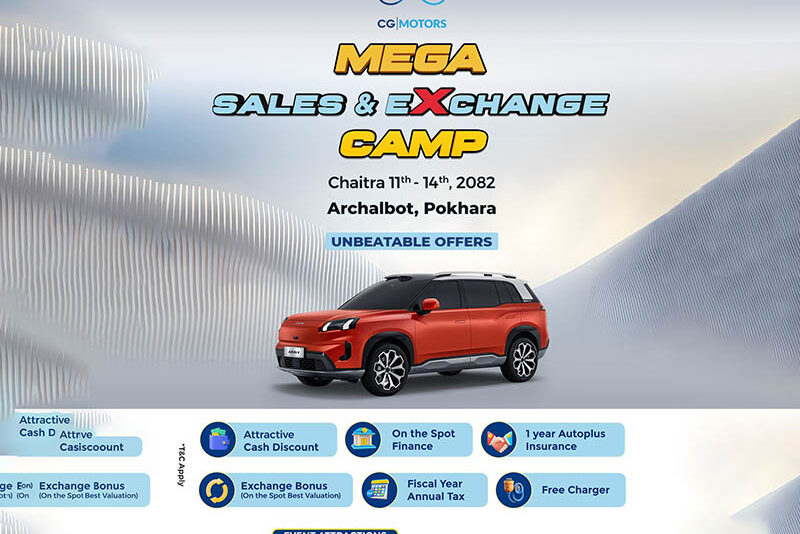 यो एक्सचेन्ज क्याम्प आजै देखि सीजी मोटर्स, अर्चलबोट, पोखरामा सुरु भएको छ र आगामी शनिबार सम्म आयोजना हुनेछ। कार्यक्रममा सहभागी हुने आगन्तुकहरूले ग्राहक केन्द्रित वातावरणमा विशेष अफरहरू, टेस्ट ड्राइभ अवसरहरू तथा अपग्रेड अनुभव गर्न सक्नेछन्, जसले विद्युतीय सवारीतर्फको परिवर्तनलाई सरल र सहज बनाउने उद्देश्य राखेको छ।