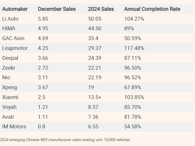 सार्वजनिक सूची अनुसार लि अटो, हार्मोनी इन्टेलिजेन्ट मोबिलिटी एलायन्स (हिमा) र जीएसी एयोनले टप थ्रीको दावी गरेका छन् । यी तीन कम्पनीले समग्रमा यो वर्ष ३ लाख ५० हजार सवारी साधन बिक्री गरेका छन् । चीनमा यो वर्ष यस्ता न्यु इनर्जी प्यासेन्जर भेइकल १ करोड १० लाख युनिट बिक्री भएको बताइएको छ ।