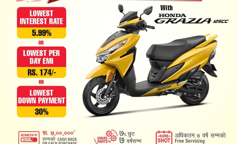 होन्डा मोटरसाइकलको नेपालका लागी आधिकारिक वितरक स्याकार ट्रेडिङ कम्पनीले सरल फाइनान्स अन्तर्गत मोटरसाइकल र स्कुटर खरिद गर्न चाहने ग्राहकलाई तीन मध्ये कुनै एक विपल्प छनोट गर्ने अवसर दिएको छ । जसमध्ये होन्डाको लोकप्रिय स्कुटर ग्राजिया खरिद गर्दा ग्राहकले सवैभन्दा कम दरको व्याज, सवैभन्दा कम रकम दैनिक किस्ता र कम रकम डाउनपेमेन्ट मध्ये एक छनोट गर्न पाउनेछन् ।