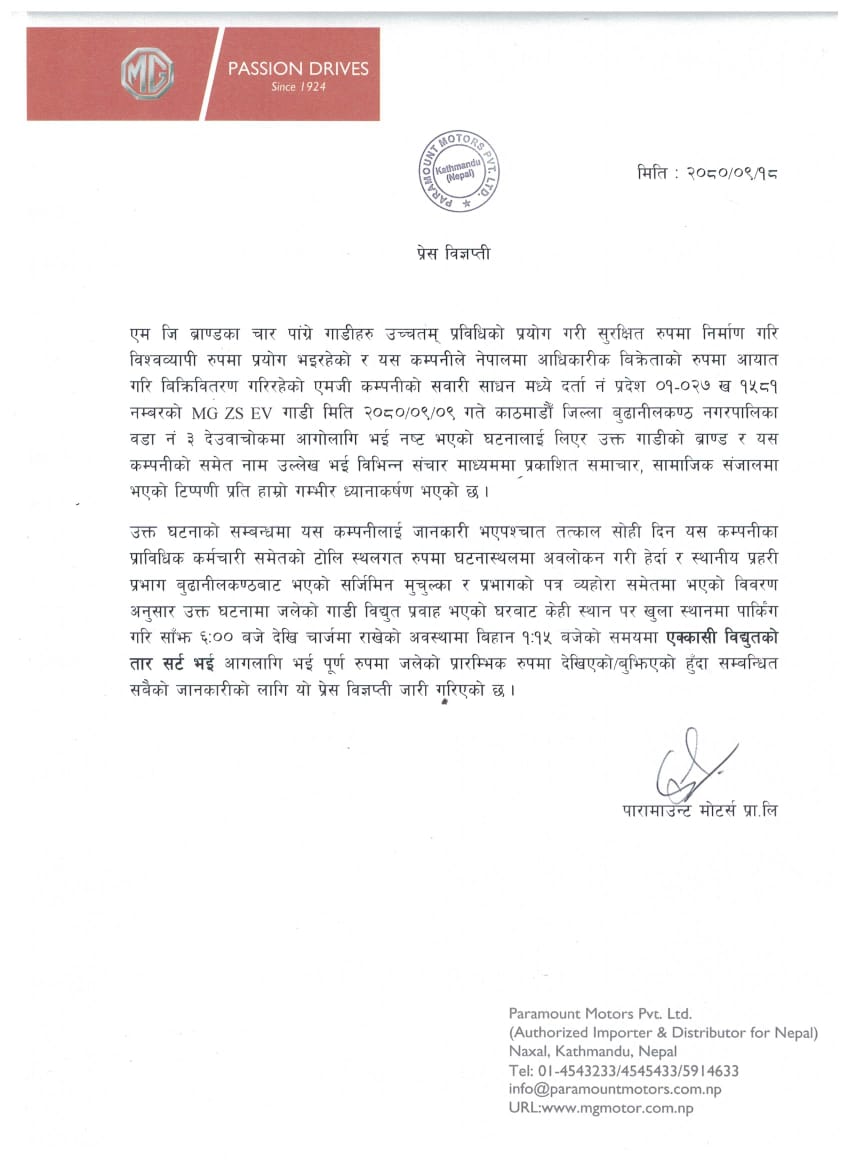 काठमाडौं – हाल चर्चामा रहेको एमजी जेडएस ईभी आगलागीको कारण सर्ट सर्किट भएको कम्पनीले बताएको छ । नेपालका लागि एमजी जेडएस ईभीको नेपालका लागि आधिकारिक वितरक पारामाउन्ट मोटर्सले एक विज्ञप्ति सार्वजनिक गर्दै सो जानकारी दिएको हो ।