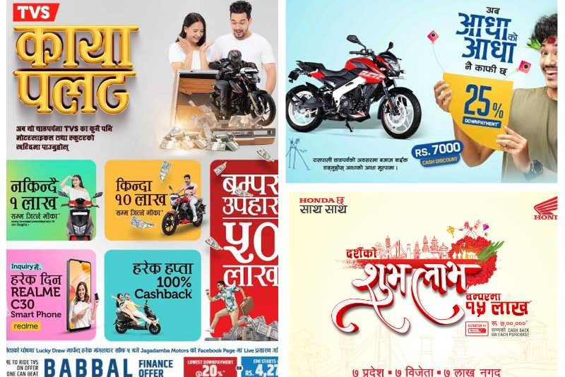 काठमाडौं – नेपाली बजारमा उपलब्ध विभिन्न ब्रान्डका बाइक मध्ये तीन ठूला बाइक कम्पनी होन्डा, बजाज र टीभीएसले एकै पटक फेस्टिभल स्किमको घोषणा गरेका छन् । दसैं तिहार जस्ता चाडपर्व नजिकिएसँगै यी कम्पनीहरुले आज नयाँ स्किम सार्वजनिक गरेका हुन् ।