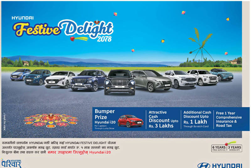 काठमाडौं – हुन्डाईको नेपालका लागि आधिकारिक वितर लक्ष्मी इन्टरकन्टिनेन्टल प्रालिले ‘हुन्डाई फेस्टिभ डिलाइट २०७८’ योजना ल्याएको छ । दसैं, तिहार र छठ पर्वलाई उत्सवमय बनाउने लक्ष्यसहित यो योजना ल्याइएको कम्पनीको भनाइ छ ।
