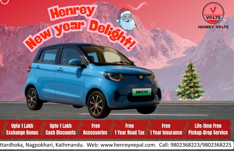 काठमाडौं–हेनरी ईभीको नेपालका लागि आधिकारिक वितरक एसक्यूव इन्टरप्राइजेजले नयाँ वर्ष २०२६ लाई लक्षित गरी आकर्षक अफर सार्बजनिक गरेको छ । कम्पनीले हेनरीको मिनी कार भोल्ट्समा नयाँ वर्ष डिलाइट अफर ल्याएको हो । अफर सिमित अवधीका लागि लागु हुने जनाइएको छ ।