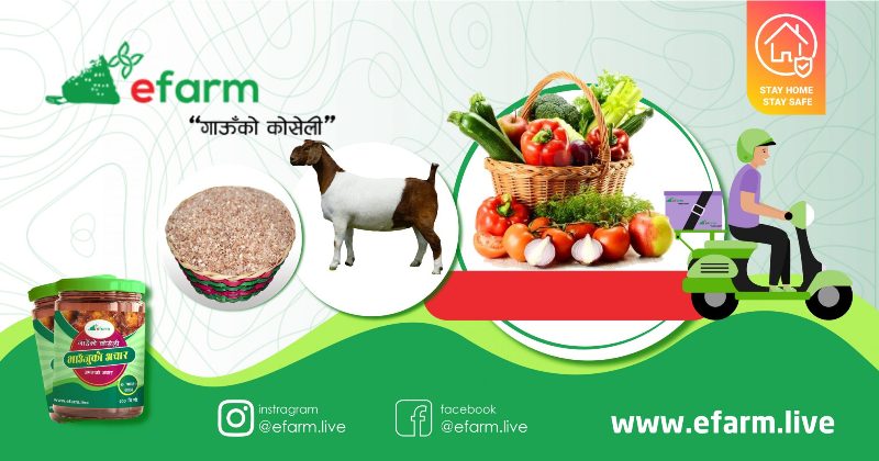 गाउँका किसानलाई शहरका उपभोक्तासँग जोड्दै आएको इ फार्मले कोभिड–१९ को विषम परिस्थितिमा पनि घर घरमै फलफूल, तरकारी र मासुको काठमाडौ उपत्यकामा होम डेलिभरी गर्दै आएको छ।