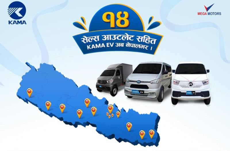 काठमाडौं–चिनियाँ ईभी ब्रान्ड कामाले नेपालका विभिन्न स्थानमा सेल्स आउटलेट विस्तार गरेको छ । कामाको नेपालका लागि आधिकारिक वितरक मेगा मोटर्सले देशका १४ स्थानका सेल्स आउटलेट विस्तार गरेको हो ।
