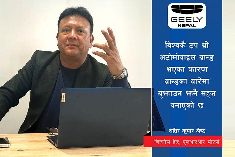 चिनियाँ अटो निर्माता कम्पनी जिलीले उत्पादन गरेको विद्युतीय कार ईएक्स५ नेपाली बजारमा बिक्री हुँदै आएको छ । गत भदौमा सम्पन्न नाडा अटो शोमार्फत लन्च गरिएको यस एसयूभीले अहिले बजारमा निकै राम्रो चर्चा पाइरहेको छ । एलआरआर मोटर्स आधिकारिक बिक्रेता रहेको ईएक्स५ को बजार अवस्था, नेपालमा जिलीको रणनीति र बिक्रीपछिको सेवा लगायत विविध विषयमा कम्पनीका बिजनेस हेड अधिर कुमार श्रेष्ठसँग गरिएको कुराकानी :