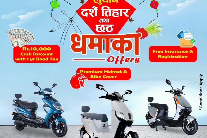 काठमाडौं– लुयान स्कुटरको नेपालका लागि आधिकारिक वितरक ‘जिरो इमिसन राइड (एन)’ ले ‘ दशैं तिहार तथा छठ धमका अफर ल्याएको छ । ‘देशको उर्जा, देश मै खपत अभियान’ भन्ने मुल नाराका साथ चीनमा निर्मित गुणस्तरीय र विश्वप्रशिद्ध ब्राण्ड ‘लुयान’का विद्युतीय स्कुटरहरु बिक्री गर्दै आएको कम्पनीले आजदेखी लागु हुनेगरी फेस्टिबल अफर ल्याएको हो ।