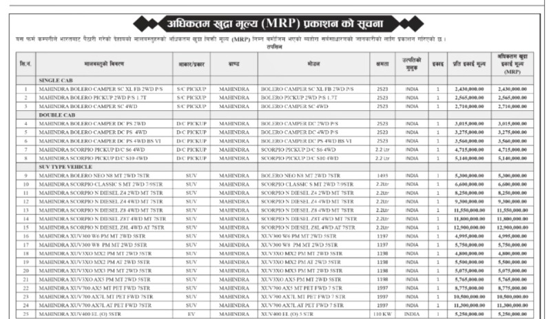महिन्द्राका सबै मोडलको पछिल्लो मूल्य सूची यस प्रकार छ :