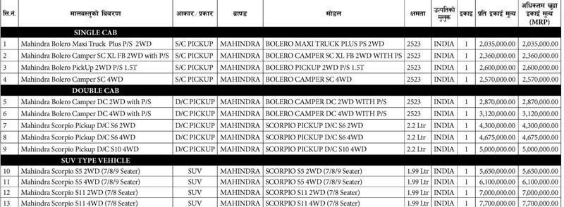 नेपाली बजारमा उपलब्ध महिन्द्राका गाडीहरु मध्ये सबैभन्दा धेरै बिक्री हुने दुई मोडल हुन् स्कोरपियो र बोलेरो । रेटिङ एजेन्सी इक्राले हालै सार्वजनिक गरेको तथ्यांक अनुसार सन् २०२२ मा महिन्द्राको व्यवसायमा यी दुई मोडलको हिस्सा ९६ प्रतिशत छ । यो भन्दा पहिले सन् २०२१ मा यी दुई मोडलको हिस्सा ९१ प्रतिशत थियो । नेपालमा अग्नि इन्कर्पोरेटेड प्रालिले महिन्द्राका सवारी साधन बिक्री–वितरण गरिरहेको छ ।