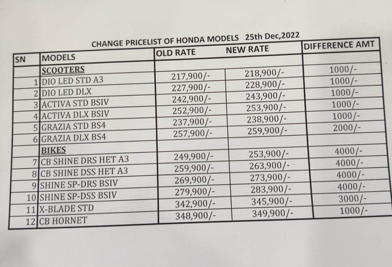 सीबी हर्नेट मोटरसाइकल र डियो तथा एक्टिभा स्कुटरमा १ हजार रुपैयाँ मूल्य बढेको छ ।