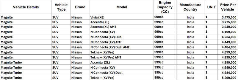 नयाँ म्याग्नाइट अझ ‘बोल्डर’ डिजाइन, उत्कृष्ट सुरक्षा विशेषताहरू र अत्याधुनिक प्रविधिसहित आएको छ, जसले उत्कृष्ट मूल्यलाई कायम राख्दै अतुलनीय ड्राइभिङ अनुभव सुनिश्चित गर्छ । म्याग्नाइट लाइनअप चारवटा ‘रिफ्रेस्ड’ भेरिएन्टहरूमा उपलब्ध छ, जसमा ‘भिजिया’, ‘एक्सेन्टा’, ‘एन–कनेक्टा’ र ‘टेक्ना–प्लस’ समावेश छन् । उपलब्ध हरेक विशेषतासहितको शीर्ष भेरिएन्टको मूल्य ५२ लाख ९९ हजार रुपैयाँ सम्म पर्न जान्छ भने भिजिया र एक्सेन्टाको मूल्य यथावत् राखिएको छ । यी भेरिएन्टहरूमा नयाँ म्याग्नाइटको जम्मा १३ प्रकारका ‘कन्फिगरेसन’हरू उपलब्ध छन्, जसमा ‘टर्बो–पेट्रोल’ र ‘नेचुरल्ली एस्पिरेटेड इञ्जिन’ सहित म्यानुअल र अटोमेटिक ट्रान्समिसनका विकल्पमा उपलब्ध छन् ।