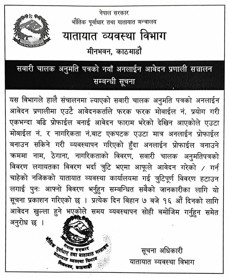 अनलाइन प्रोफाइल बनाउने क्रममा फारम भर्दा कुनै त्रुटि भएको भए नजिकको यातायात व्यवस्था कार्यालयमा गई त्रुटिपूर्ण विवरण हटाएर फेरि नयाँ विवरण भर्न समेत विभागले अनुरोध गरेको छ ।