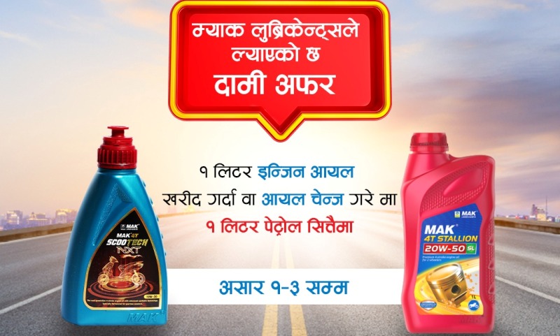 म्याक लुव्रिकेन्ट्सको नेपालका लागी आधिकारिक विक्रेता सिप्रद्धि ट्रेडिङ प्रालिले एक लिटर इन्जिन आयलको खरिदमा एक लिटर पेट्रोल निशूल्क उपलब्ध गराएको छ । हिँजोदेखी शुरु भएको म्याकको दामी अफर अन्तर्गत ग्राहकले उपत्यकाका तीनवटा पेट्रोल पम्पवाट यो अफर पाउन सक्नेछन् ।