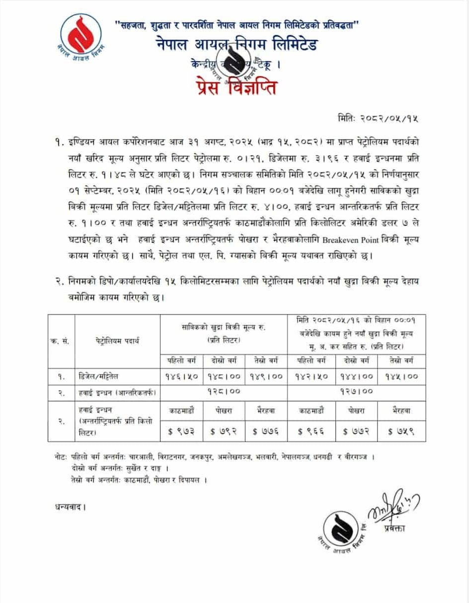 निगमका अनुसार, डिजेल र मट्टीतेलको मूल्य प्रतिलिटर चार रुपैयाँ घटाइएको छ । त्यस्तै, हवाई इन्धन आन्तरिकतर्फ प्रतिलिटर एक रुपैयाँ र अन्तर्राष्ट्रियतर्फ काठमाडौंका लागि प्रतिलिटर अमेरिकी डलर सात रुपैयाँले घटाइएको जनाइएको छ ।
