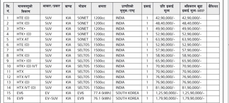 किया सोनेट र सेल्टोस भने भारतमै उत्पादन हुने गरेका छन् । किया सोनेट विभिन्न ५ भेरिएन्टमा उपलब्ध छ । यसको मूल्य ४२ लाख ९० हजार देखि ६३ लाख ९० हजार रुपैयाँ सम्म छ ।