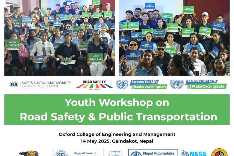 आठौं यूएन ग्लोबल रोड सेफ्टी विकको अवसरमा गैंडाकोटस्थित अक्सफोर्ड कलेज अफ इन्जिनियरिङ एन्ड म्यानेजमेन्टमा नेपाल अटोमोबाइल्स एसोसिएसनको आयोजना र युथ फर रोड सेफ्टी इन नेपालको व्यवस्थापनमा युवा वर्कशप तथा अन्तरक्रिया कार्यक्रम सम्पन्न भयो ।