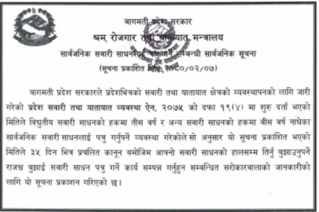 ‘बागमती प्रदेश सरकारले प्रदेशभित्रको सवारी तथा यातायात क्षेत्रको व्यवस्थापनको लागि जारी गरेको प्रदेश सवारी तथा यातायात व्यवस्था ऐन, २०७५ को दफा १९ ९ ४ ० मा सुरु दर्ता भएको मितिले विद्युतीय सवारी साधनको हकमा ३० वर्ष र अन्य सवारी साधनको हकमा २० वर्ष नाघेका सार्वजनिक सवारी साधनलाई पत्रु गर्नुपर्ने व्यवस्था छ,’ जारी सूचनामा उल्लेख छ ।