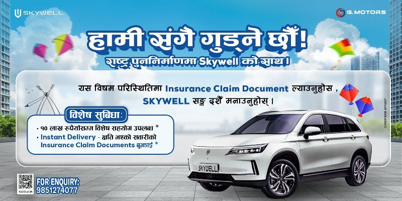 कम्पनीले एक विज्ञप्ति जारी गर्दै भनेको छ, ‘अहिलेको बिषम परिस्थितिमा आर्थिक मन्दी लगायत देशभरी भएको अपुरणिय क्षतिका क्रममा धेरै सवारी साधनहरु पूर्णरुपमा भएको क्षतिले गर्दा नेपालीहरुको महान चाडबाड दशैं एवम् तपाईंको दैनिक साथै व्यावसायिक साझेदार बन्न विद्यमान परिस्थितिलाई मध्यनजर गर्दै ‘स्काईवेल जी मोटर्स परिवार’ ले तपाईंको सहयोगी बन्दै तुरुन्तै नयाँ स्काईवेल ईभी सवारी डेलिभरी गर्ने विशेष योजना ल्याएको छ ।’