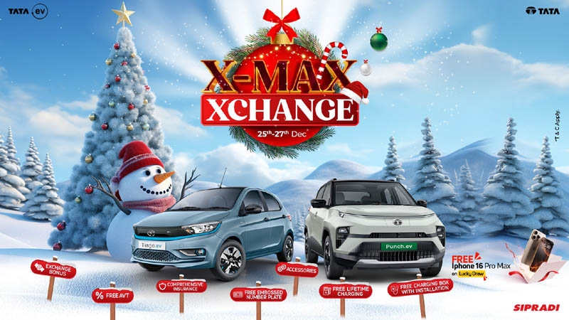 काठमाडौँ - यस वर्षको क्रिसमसका अवसरमा नेपालका लागि टाटा मोटर्सको अधिकारिक वितरक सिप्रदी ट्रेडिङले यही पौष १० देखि १२ सम्म ‘एक्समस एक्सचेन्ज’ कार्यक्रम आयोजना गरेको छ । टाटा ब्राण्डका गाडीहरु लिन खोज्ने ग्राहकहरूलाई उत्कृष्टभन्दा उत्कृष्ट रूपमा आफ्नो प्रतिबद्धता स्वरूप सिप्रदीले ‘एक्समस एक्सचेन्ज’ कार्यक्रम आयोजना गरेको हो ।