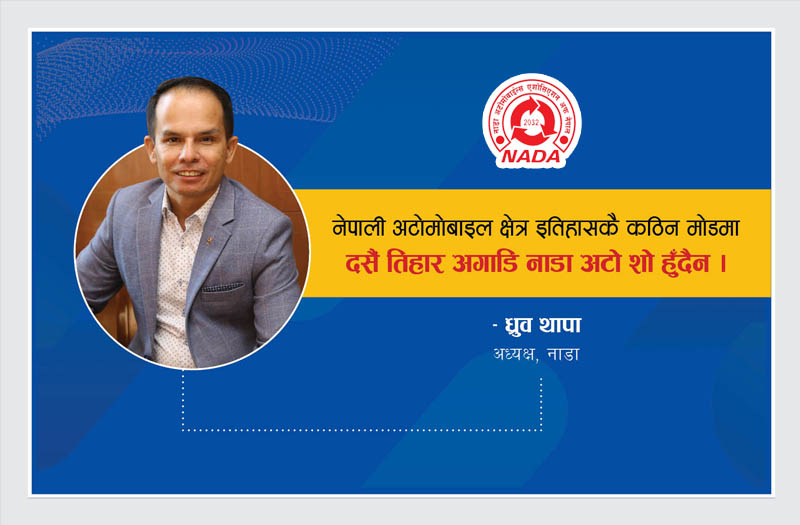 यसै सन्दर्भमा नेपाली अटोमोबाइल व्यवसायको वर्तमान अवस्था र आगामी सम्भावना विषयमा नाडा अटोमोबाइल्स एसोसिएसन अफ नेपालका अध्यक्ष ध्रुव थापासँग गरिएको कुराकानी :