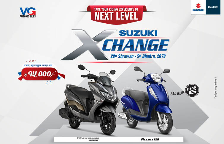 कुनै पनि कम्पनीको पुरानो बाइक वा स्कुटरको सट्टामा विश्व प्रसिद्ध जापनिज ब्रान्ड सुजुकीको नयाँ बाइक वा स्कुटर चढ्ने अवसर ग्राहकले पाउनेछन् । कुनैपनि मोटरसाइकल वा स्कुटरको प्रचलित बजार मूल्य भन्दा १५ हजार थप मूल्यांकन गरिने कम्पनीले जनाएको छ ।