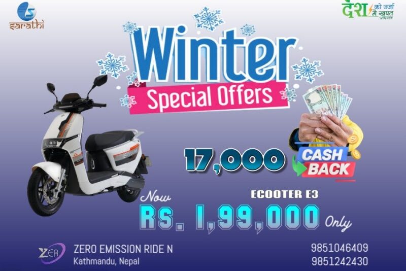 काठमाडौं–नेपाली बजारमा लोकप्रियता हाँसिल गर्दै आएको सारथी ब्राण्डको विद्युतीय स्कुटरले यो चिसो मौसमलाई अझ उत्साहपूर्ण बनाउन ‘विन्टर अफर’ सार्वजनिक गरेको छ ।