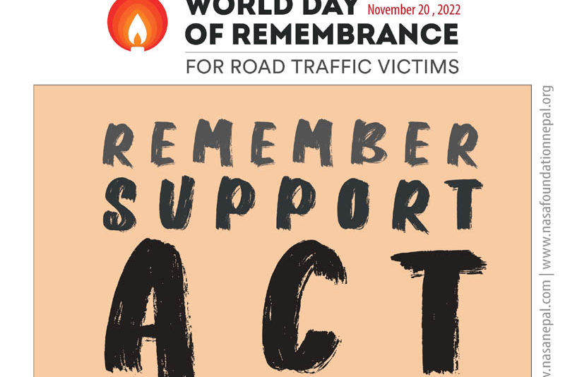 सडक दुर्घटना पीडितहरुको सम्झनामा संसार भर मनाइने विश्व सम्झना दिवस (World Day of Remembrance for Road Traffic Victims) यस वर्ष पनि नोभेम्बर महिनाको तेस्रो आइतबार संसारभरी विभिन्न कार्यक्रम गरी मनाइदै छ ।